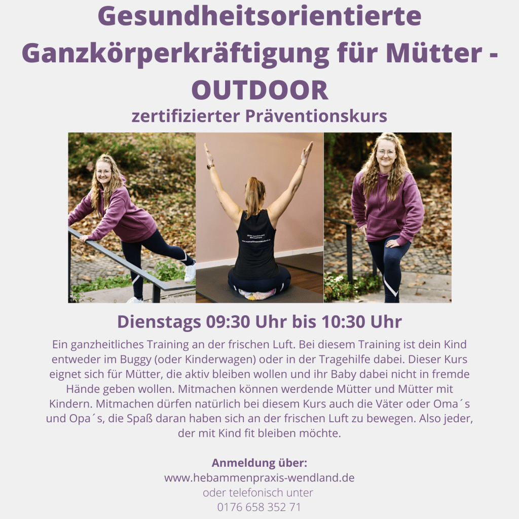 Diese gesundheitsorientierte Ganzkörperkräftigung OUTDOOR eignet sich für werdende Mütter und Mütter, die aktiv bleiben wollen und ihr Baby dabei nicht in fremde Hände geben wollen.