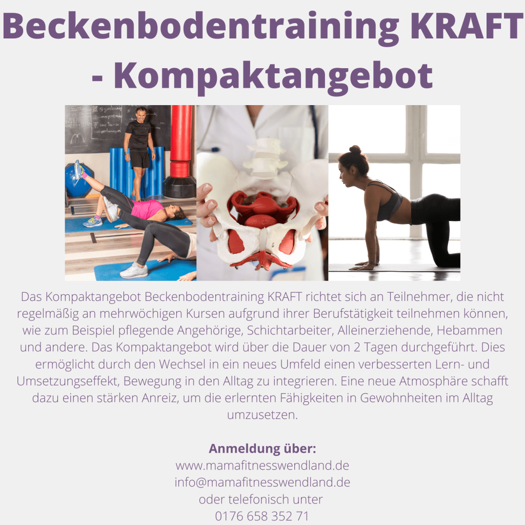 Das Kompaktangebot Beckenbodentraining KRAFT richtet sich an Teilnehmer, die nicht regelmäßig an mehrwöchigen Kursen aufgrund ihrer Berufstätigkeit teilnehmen können, wie zum Beispiel pflegende Angehörige, Schichtarbeiter, Alleinerziehende, Hebammen und andere.